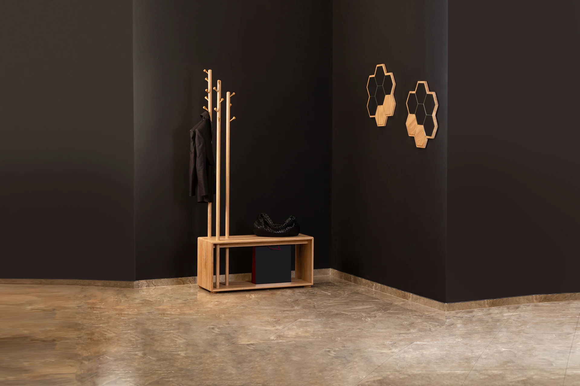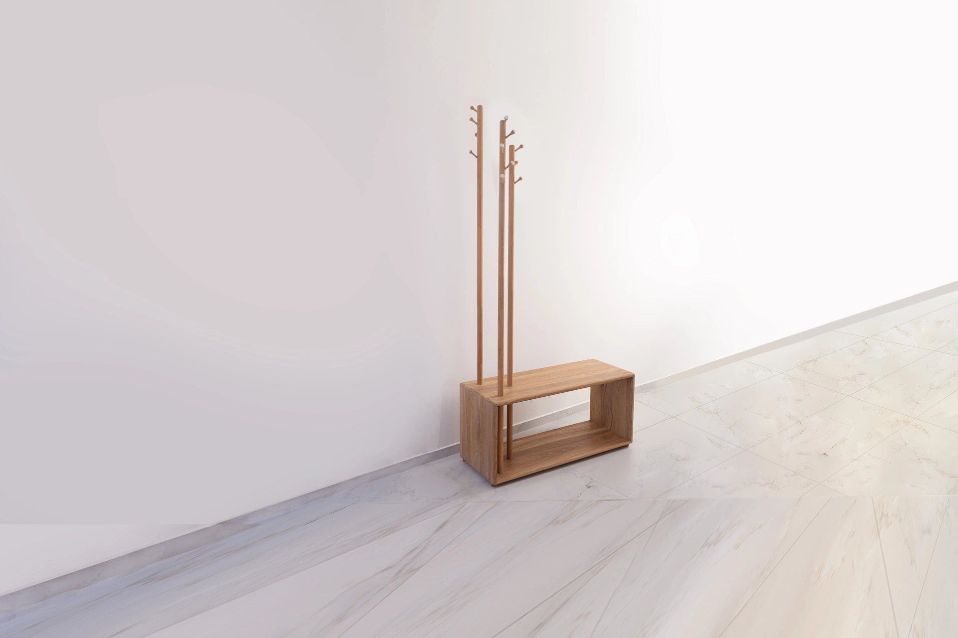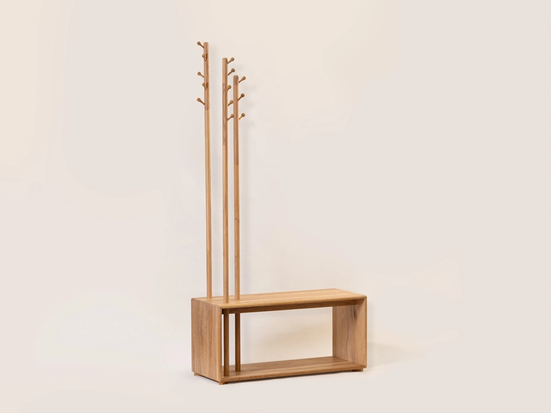 Jelka Multiverzum izrađen od trajnog punog drveta, sastoji se od kubusa dimenzija 40×100 cm i visine 50 cm, kao i oslonaca različitih visina (200, 180 i 160 cm) koje služe za kačenje stvari. Kubus može poslužiti kao mesto za sedenje, odlaganje torbi i obuće, ili čak kao kućica za vaše ljubimce. Simetričan dizajn omogućava vam da ga okrenete kako god želite, bez brige da li vam treba leva ili desna strana.