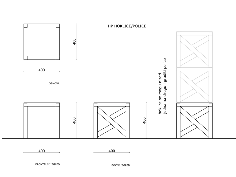 Hoklice-Police su jedan od najkompleksnijih komada nameštaja iz WMD kolekcije, pre svega zbog vremena i veštine koja je potrebna da bi se izradile, a potom i zbog njihove multi funkcionalnosti. Napravljene su od punog hrastovog drveta, lepog i trajnog prirodnog materijala, izuzetna izdržljivost ovih drvenih elemenata, ih čini pogodnim za sedenje, pa imaju funkciju od drvene stolice, preko drvenih stočića, glavnih ili pomoćnih, do polica.