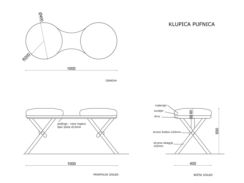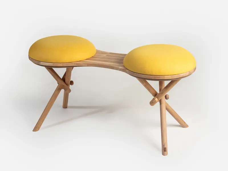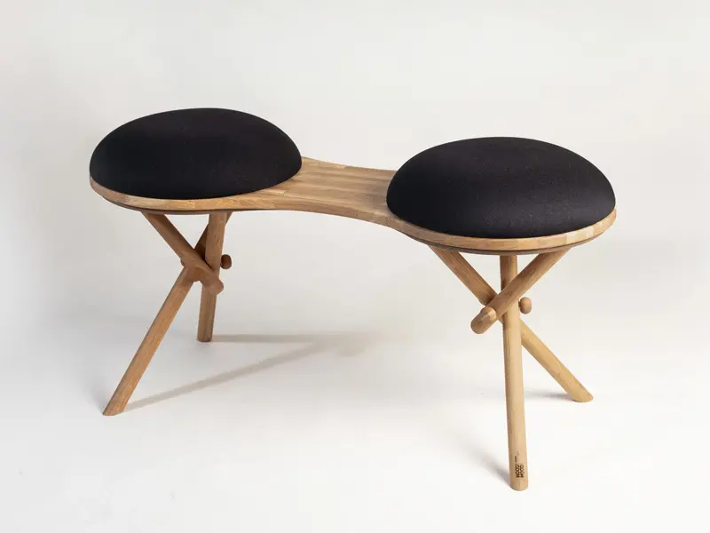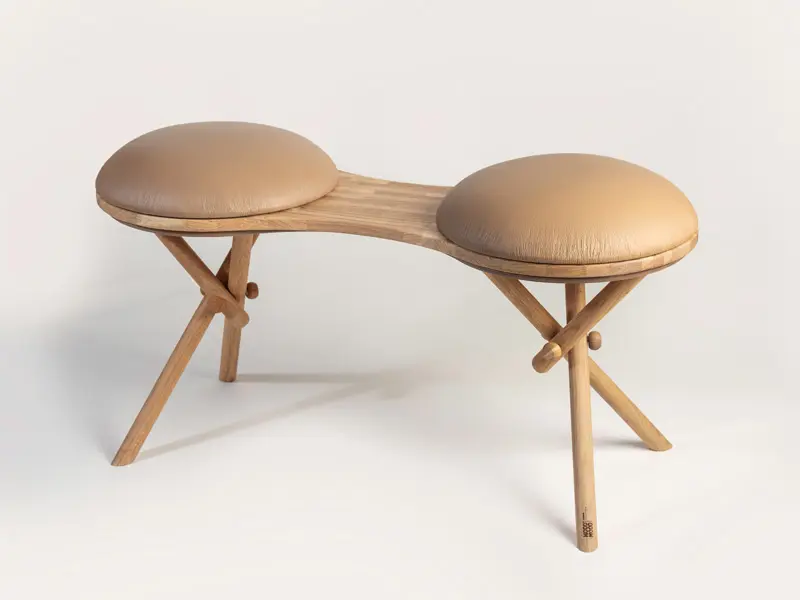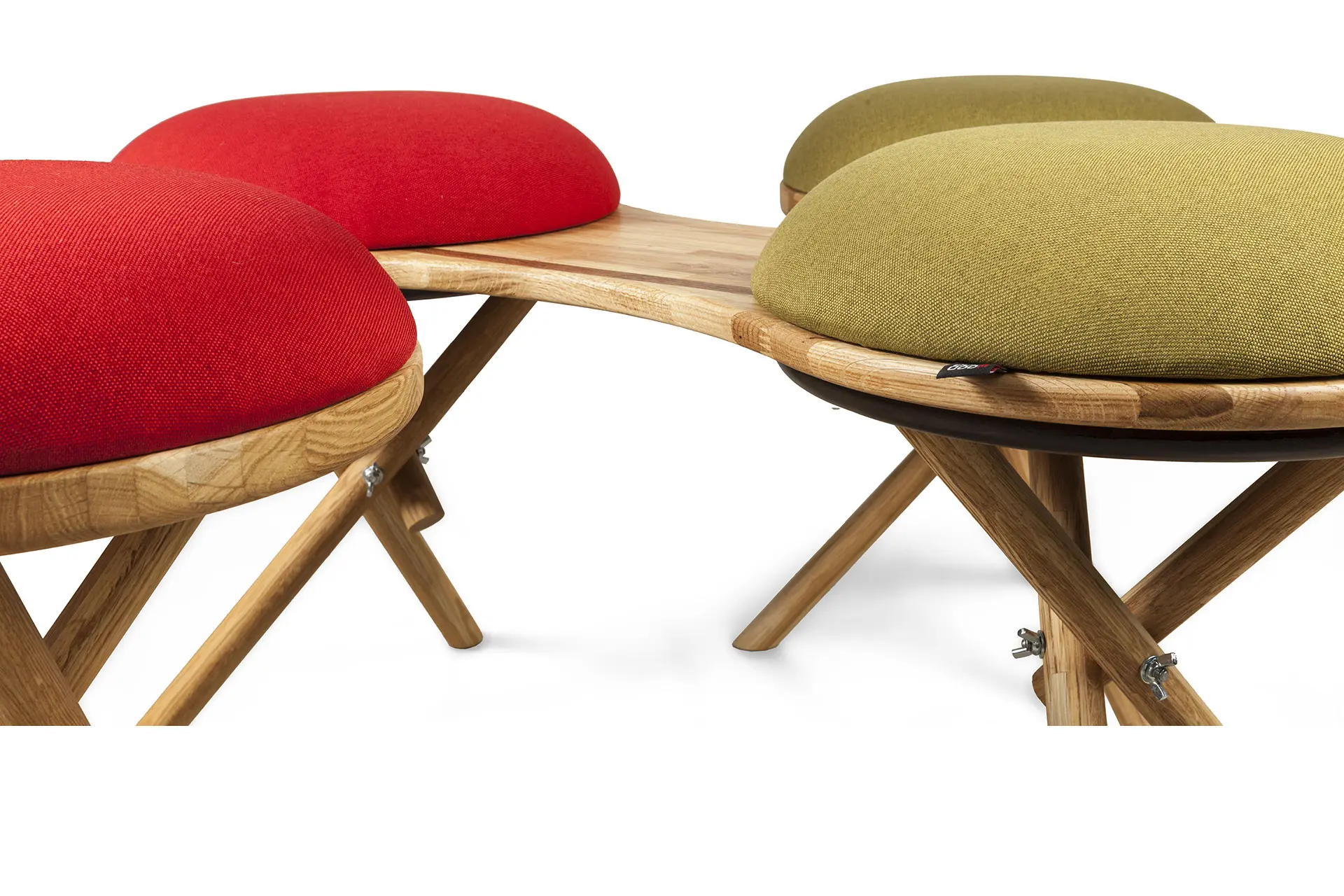 Četiri stabilna oslonca, učvršćena drvenim šrafovima, dodaju neobičan i privlačan izgled ovom komadu, koji je izrađen od kvalitetnog hrastovog, jasenovog ili bukovog drveta. Pufnica je zaštićena organskim uljima i pčelinjim voskom, čuvajući lepotu prirodnog materijala i pružajući ekološku zaštitu.