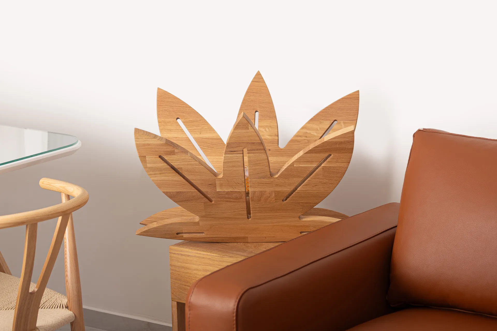 Lampa oblika lotosovog cveta, predstavlja pravo malo umetničko delo koje će vašem domu dati lepotu i originalnost. Lampa je napravljena od punog hrastovog drveta, prirodnog i kvalitetnog materijala. Sastoji se od dve celine oblikovane u listove ili krila. Zašto kažemo krila, zato što lampa može da se koristi na više načina, da se postavi frontalno, horizontalno ili vertikalno, pri čemu njen oblik dobija potpuno novo značenje. Tako da ona može imati oblik cveta, ptice ili leptira u zavisnosti kako je postavite.