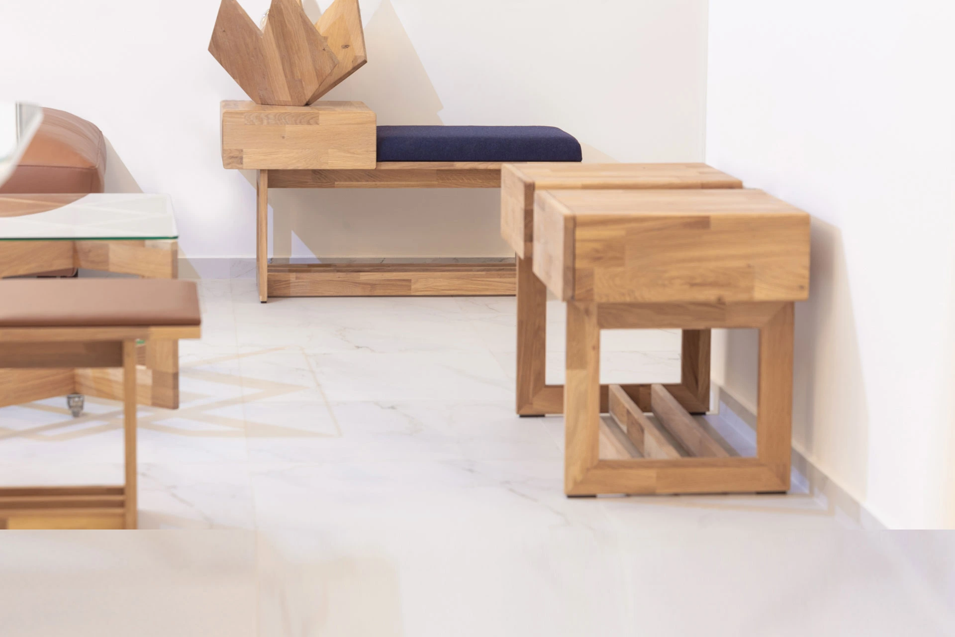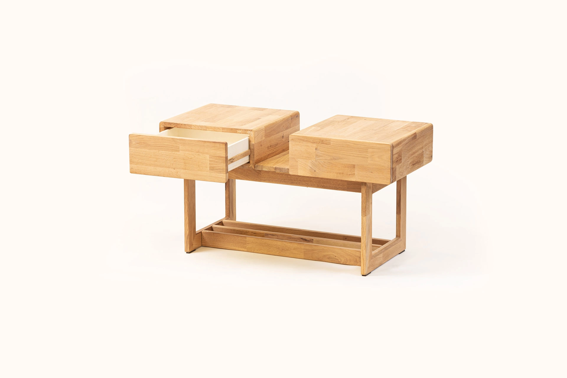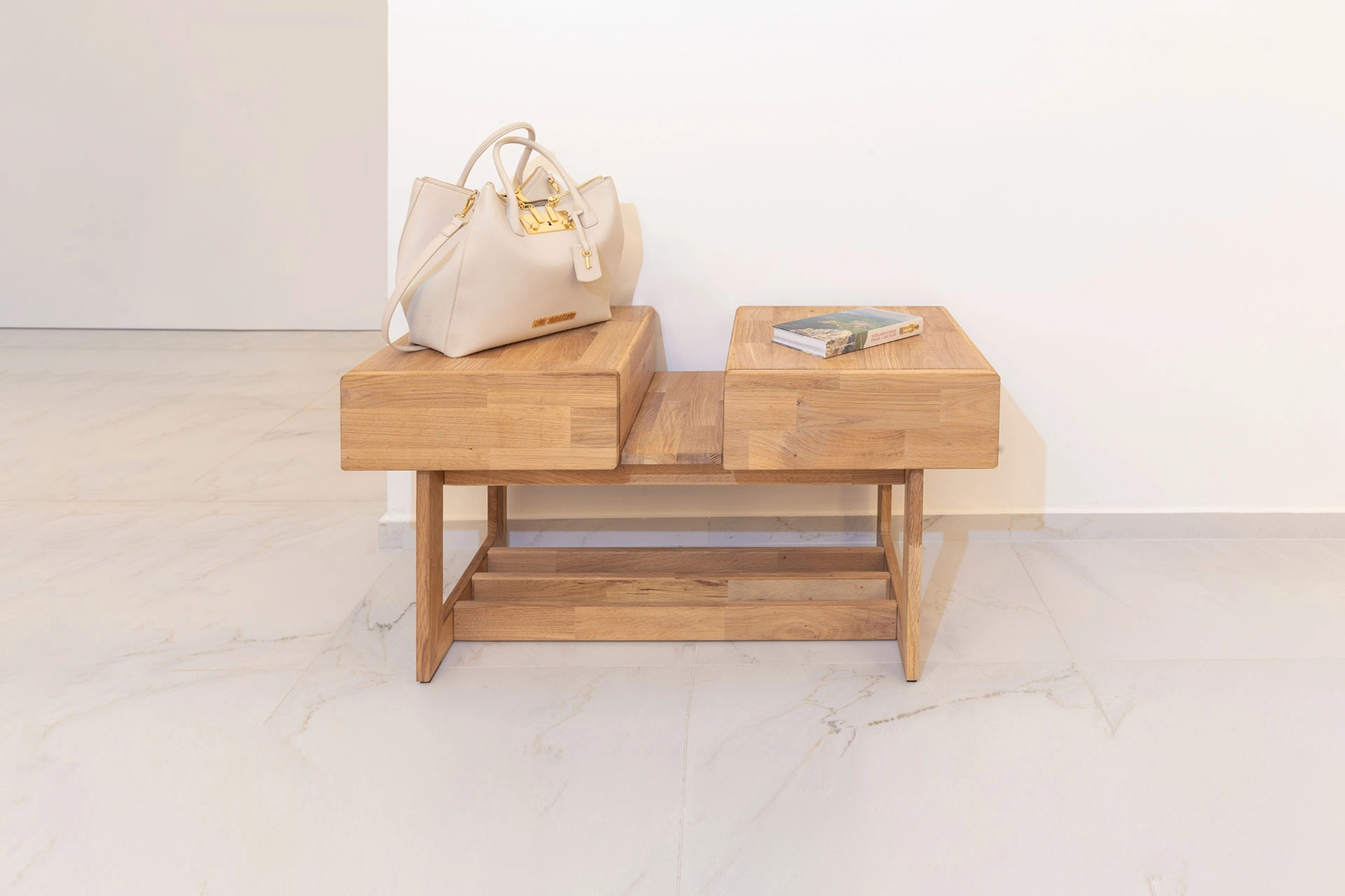 Prefinjena polica Spoj je elegantni komad nameštaja koji odiše prirodnim šarmom i vrhunskim kvalitetom. Polica je izrađena od punog hrastovog drveta sa pažljivo uljenom i brušenom površinom, zaštićenom pčelinjim voskom, prirodnom, zdravom zaštitom od insekata. Ova polica je idealna za ljubitelje prirode i drveta koji cene sofisticiran dizajn. Sastoji se od dva kubusa sa policom između, kao i jednom nižom policom koja je idealna za cipele ili kutije. Kubusi su elegantno oslonjeni na dva rama, stvarajući harmoničan i skladan izgled.