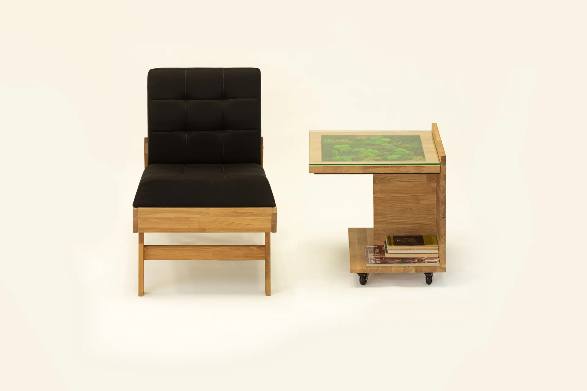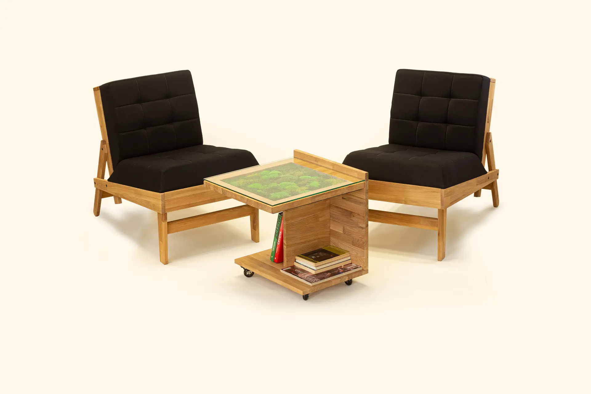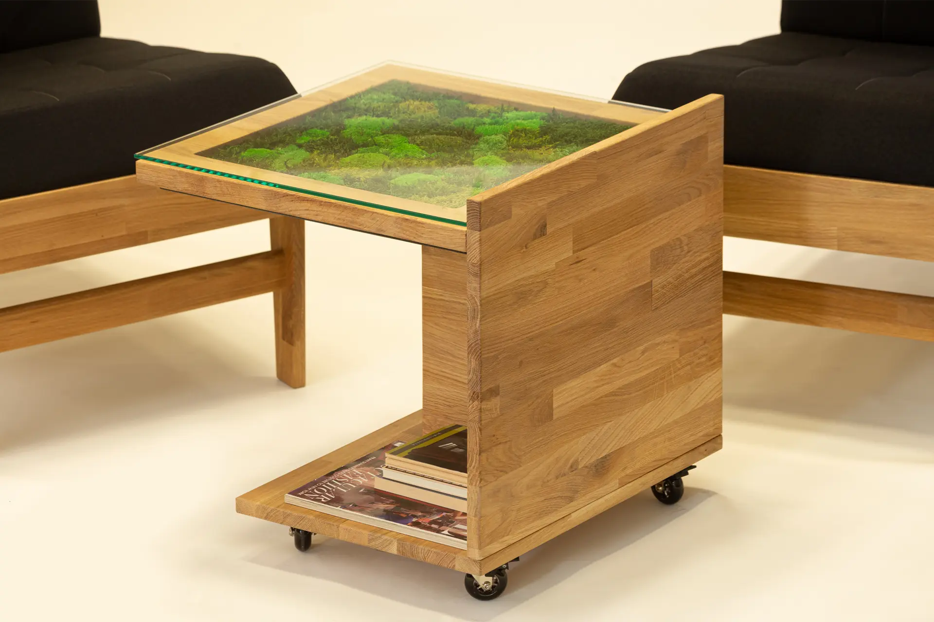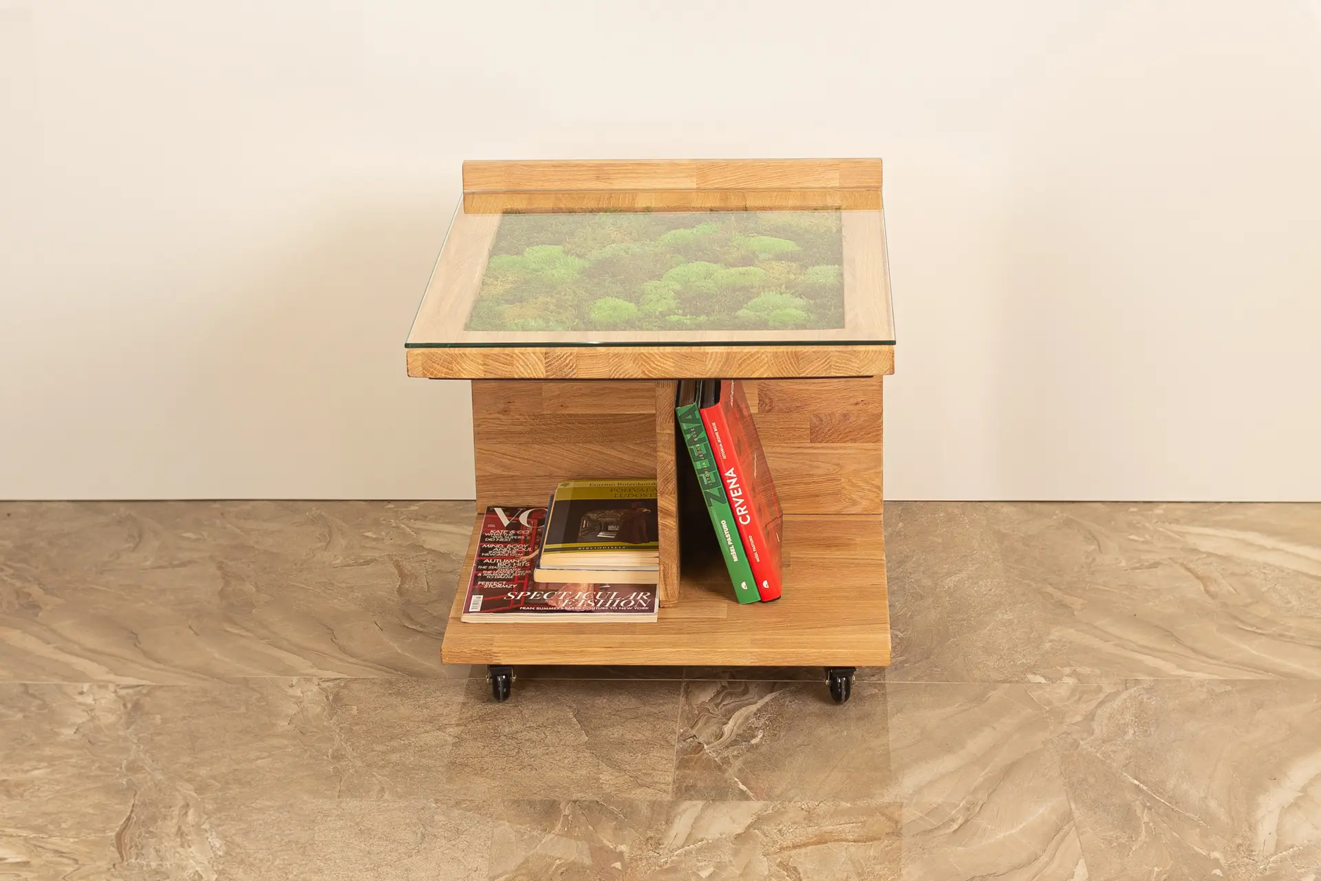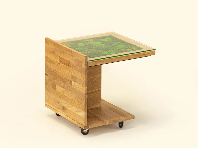 Mahovina koja ispunjava centar ploče vizuelno odmara, a toplina punog hrastovog drveta uneće duh prirode, ali i trajnost, u vaš dom. Ovaj drveni stočić dimenzija 50x50cm je lako pokretan na četiri točkića, a u prostoru zauzima visinu od 50 cm. Jednostavno se uklapa u svaki enterijer, a prirodni materijali od kojih je napravljen, koji ne zahtevaju posebno održavanje, mu pružaju dugovečnost i postojanost. Ovaj stočić kreirali smo u saradnji sa kompanijom Green wall. I mahovina koja je njegov deo ne zahteva posebno održavanje, na vama je samo da u njoj uživate!