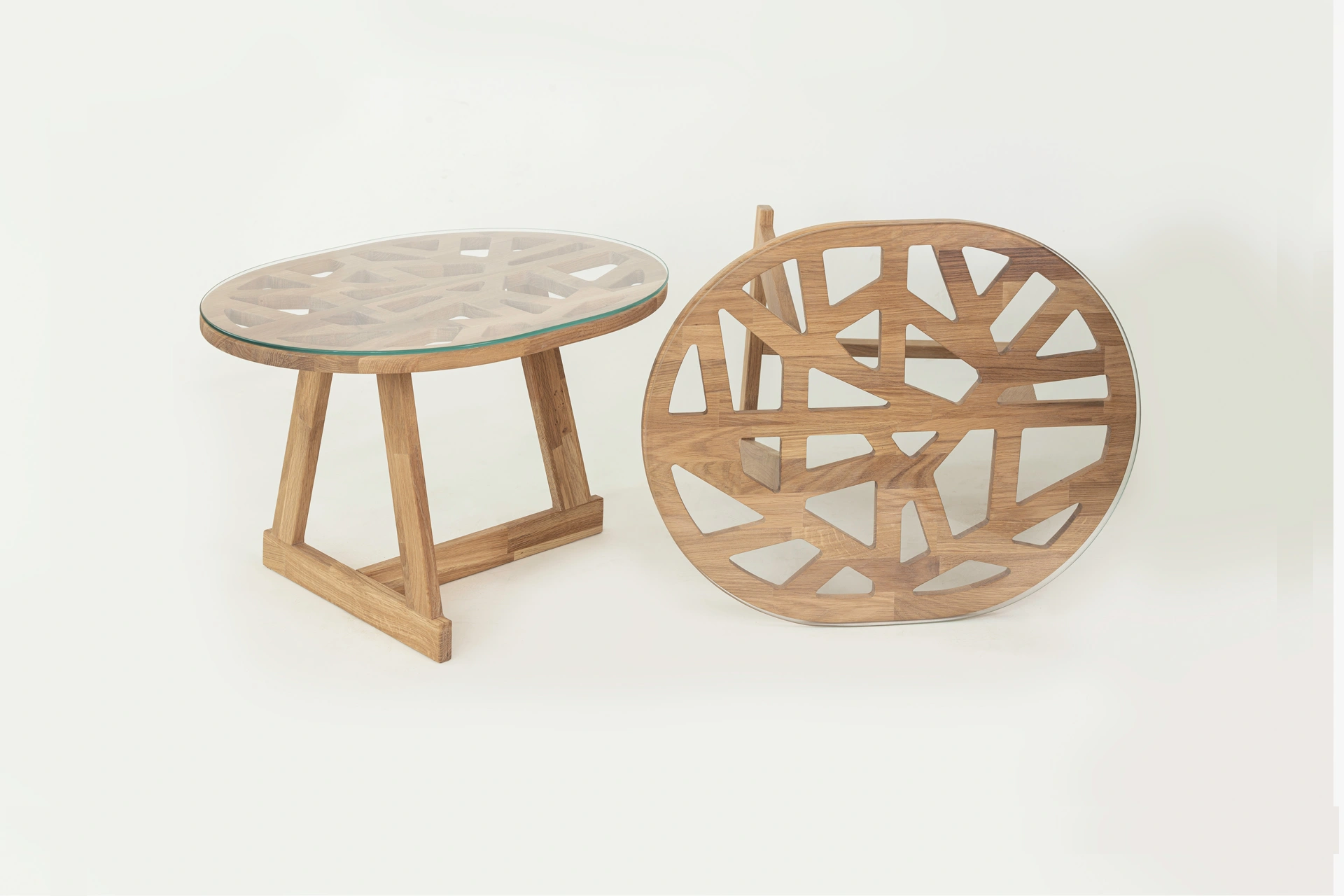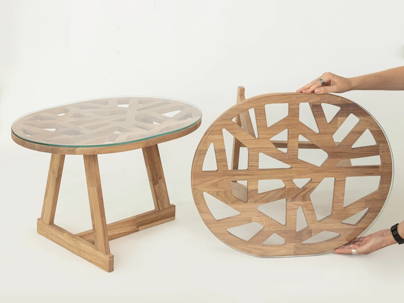 Timber sto karakteriše ploča koja je prošarana raznobojnim izrezima, podsećajući na list drveta koji su „gricnuli“ insekti – upravo je to bila inspiracija za ovaj proizvod. Ova jedinstvena struktura donosi lakoću i prozračnost, čineći da svaki enterijer izgleda živahnije i svetlije. Na ploču se postavlja staklo, omogućavajući vam da ostavite stvari na površini, dok i dalje možete uživati u originalnom dizajnu.